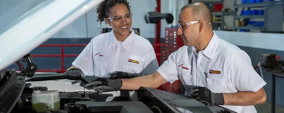 Two Les Schwab technicians inspecting a car’s battery in a garage