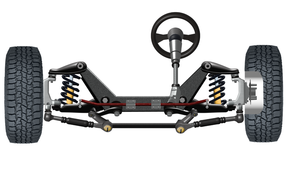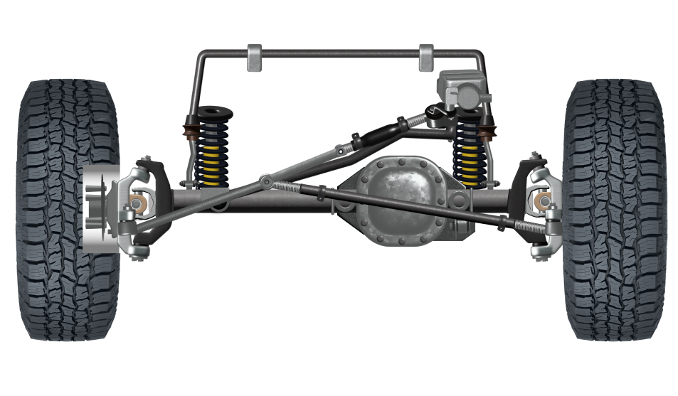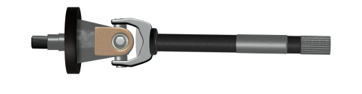 An axle shaft U-joint connects the axle shaft to the wheel hub, allowing for the transmission of power to the wheels while accommodating changes in the steering angle.